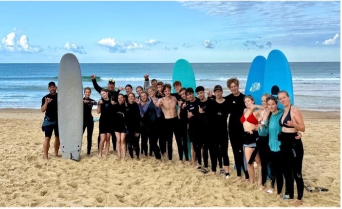 Vor Ort bezogen die Schüler*innen nach einem kurzen Einkaufs-Zwischenstopp ihre modernen und großen Apartments. Trotz der langen Anreise war die Stimmung gut und alle freuten sich auf die kommenden Tage. Jeder Morgen begann um 7:30 Uhr mit Frühsport, aus einem Lauf zum Strand und verschiedenen Sportprogrammen (von Kräftigung, über Dehnung bis zu Tanzchoreos), die im Vorfeld durch kleine Schüler*innen-Gruppen vorbereitet wurden, um sich für das Surfen vorzubereiten. Danach wurde mit frischem Baguette vom Bäcker gemeinsam gefrühstückt.