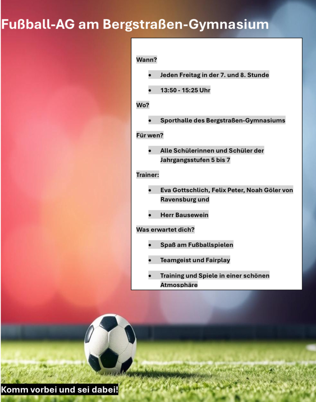 Erstes Treffen: Mo, 29.09.2025 in der Mittagspause vor dem Lehrerzimmer