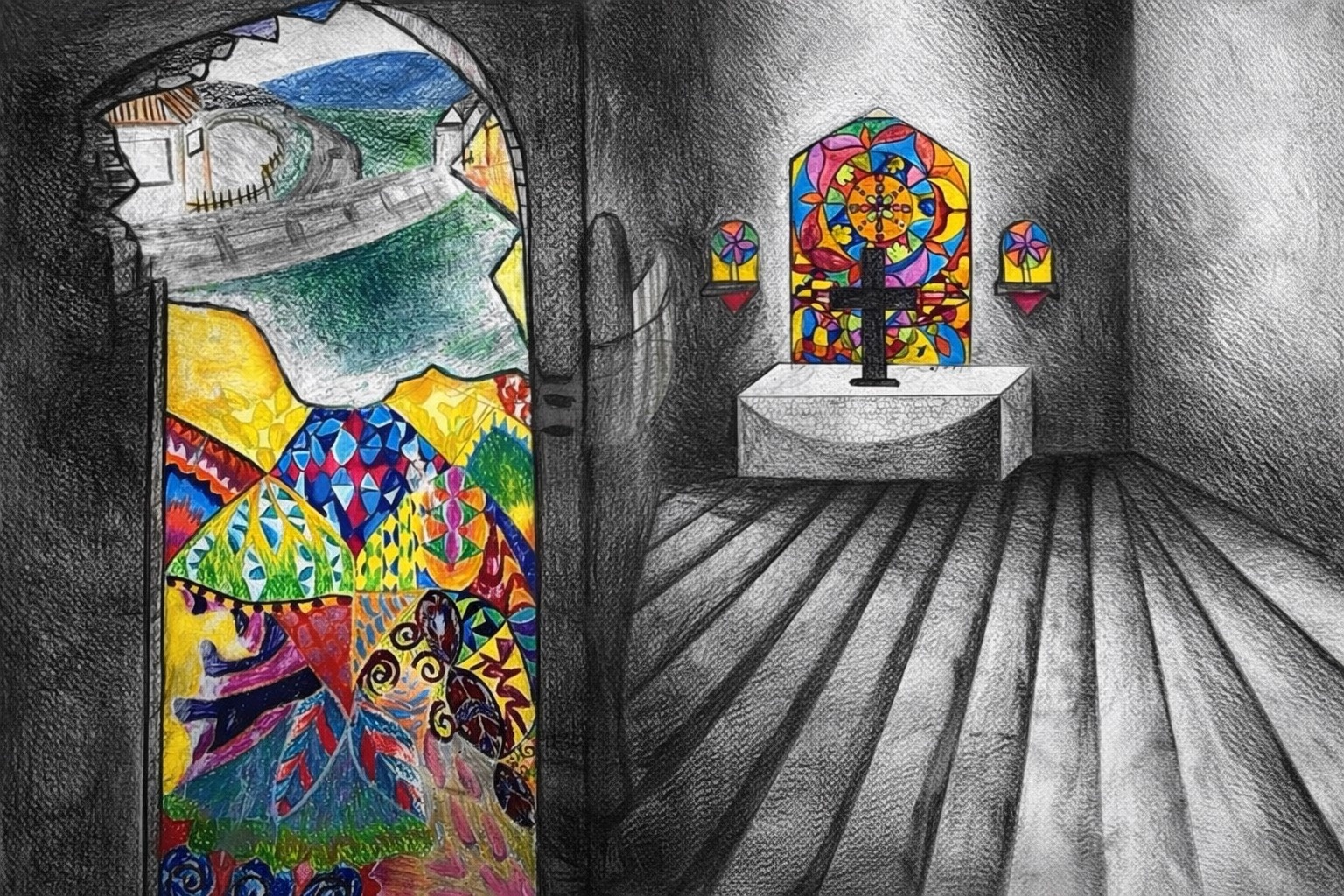 Der Innenraum: In feiner Graustufen-Schraffur konstruiert sie einen strengen, sakralen Kirchenraum in Zentralperspektive.